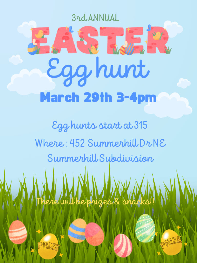 There will be two groups for the hunt – One for 7 and unders, and another for 8 and olders. Both will start at the same time, in different areas of the lawn.