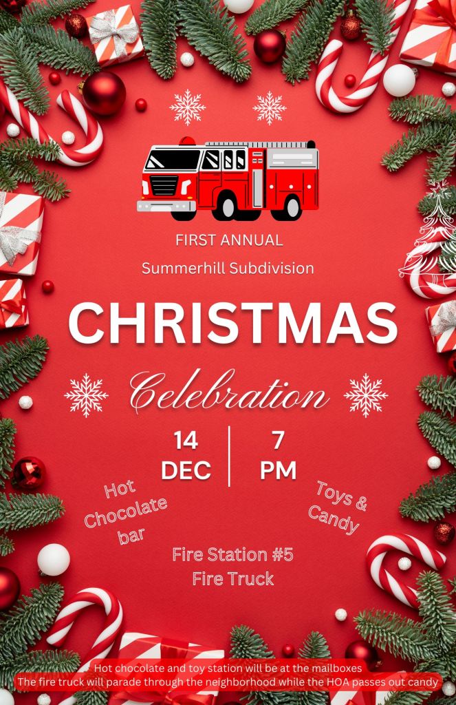 Hey neighbors! Join us for our first annual Christmas Celebration! Fire Station #5’s fire truck will parade around the neighborhood while the HOA hands out candy and toys! Merry Christmas Summerhill!!